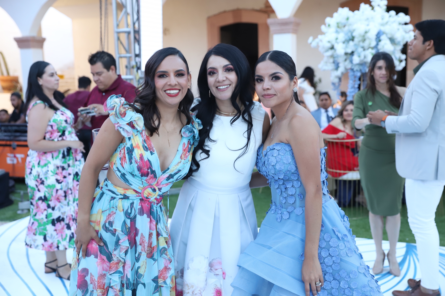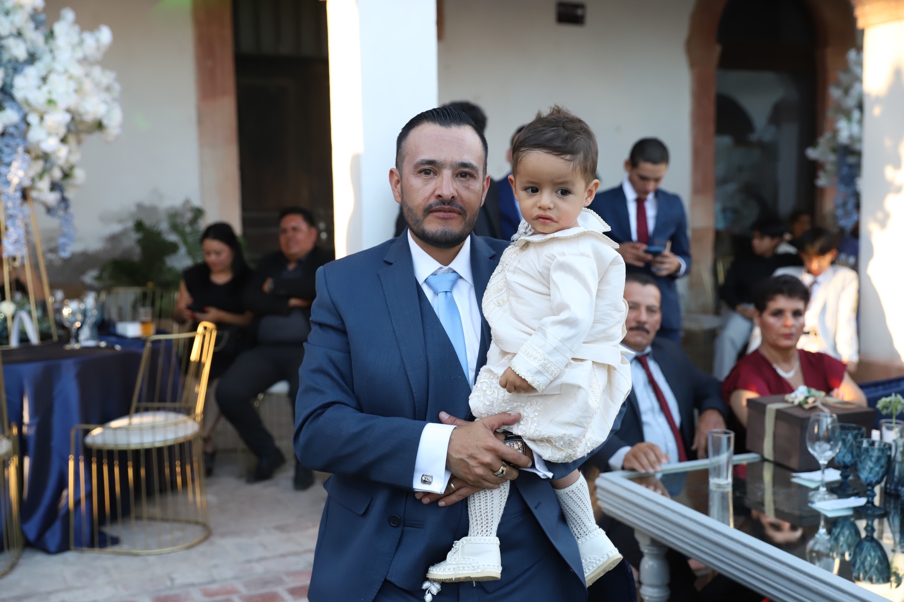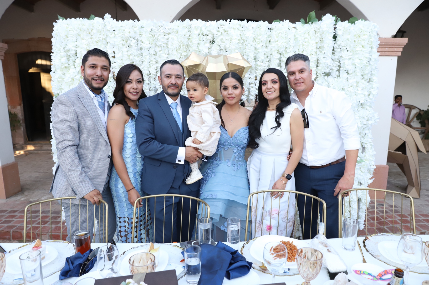 emotiva ceremonia religiosa, recibió el sacramento del bautismo y luego la presentación. Una vez concluida la ceremonia religiosa, la familia se retiró muy feliz del lugar para dar la bienvenida a sus familiares y amigos en la Hacienda El Saucillo. El entorno fue decorado con detalles florales en tonos blancos y azules, elegante mobiliario y mesas de honor, así como una refrescante coctelería para todos los asistentes, quienes al llegar felicitaron a la
