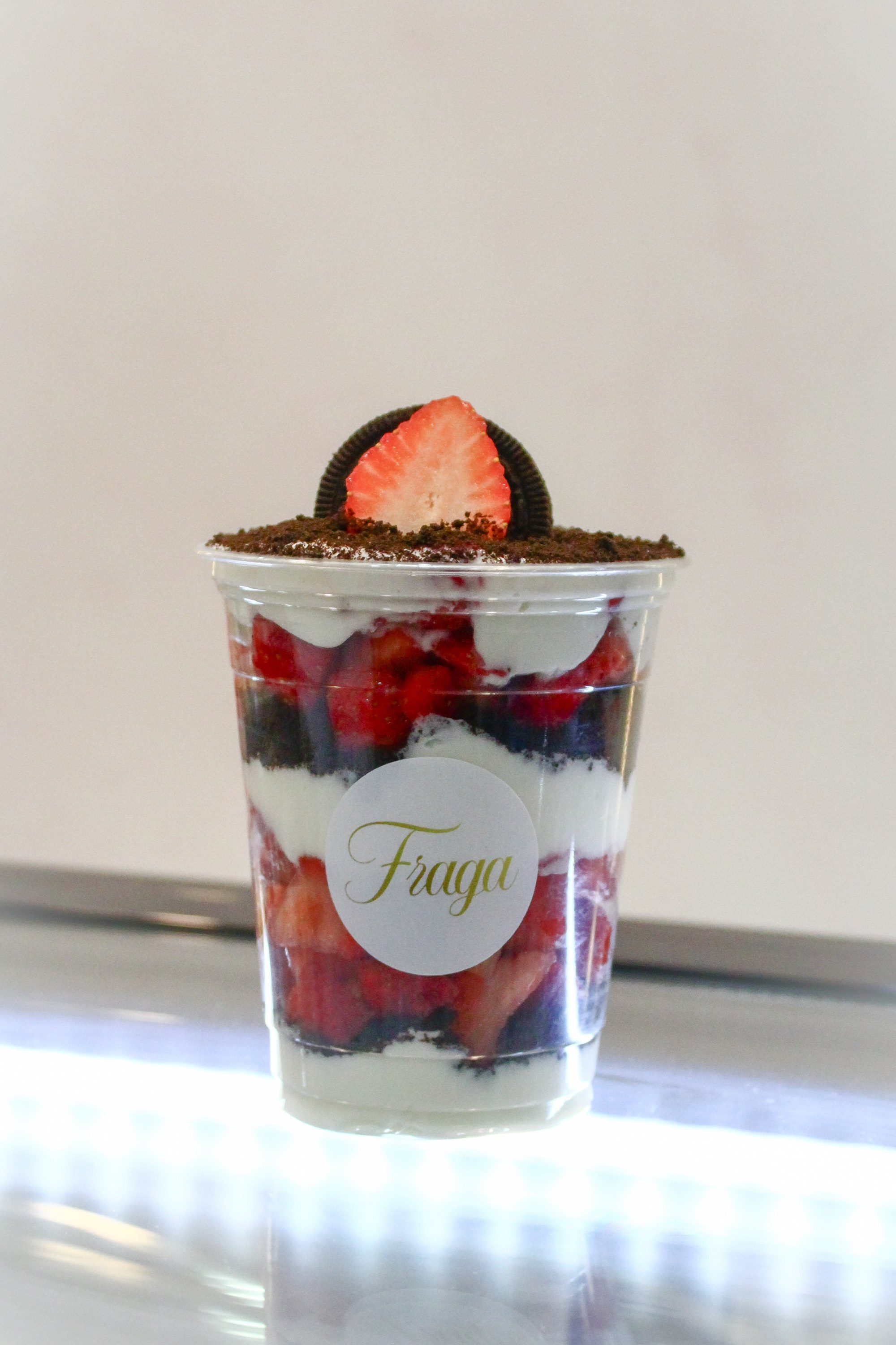 El menú de Fraga se especializa en fresas preparadas, combinadas con cremas, chocolates y una amplia variedad de toppings. Entre sus opciones destacan las Fresas Clásicas, Deli Cream, Fresas Cubiertas de Chocolate, Delifresas bañadas en chocolate, Berry Cream, Pistacream, además de deliciosos postres como brownies y DeliWafles.